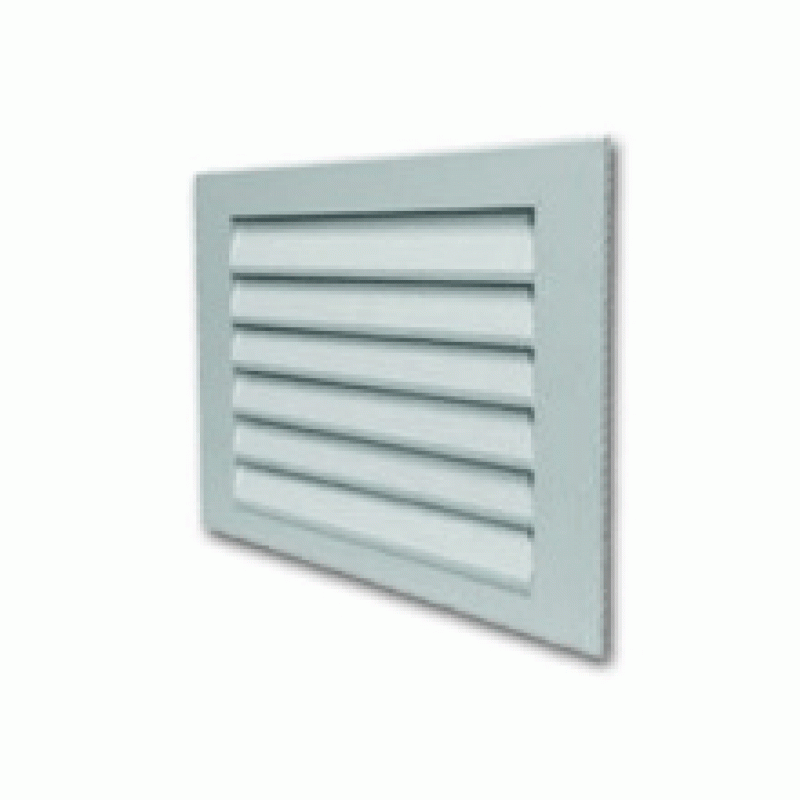 Решетки представляют собой прямоугольную раму с установленными в нее неподвижными жалюзи, которые препятствуют проникновению атмосферных осадков с улицы. Решетки устанавливаются в стену здания при помощи самонарезающих винтов, что обеспечивает простоту и надежность монтажа. В целях защиты от листвы, птиц и грызунов применяется специальная защитная сетка с Кж.с. = 0,9.